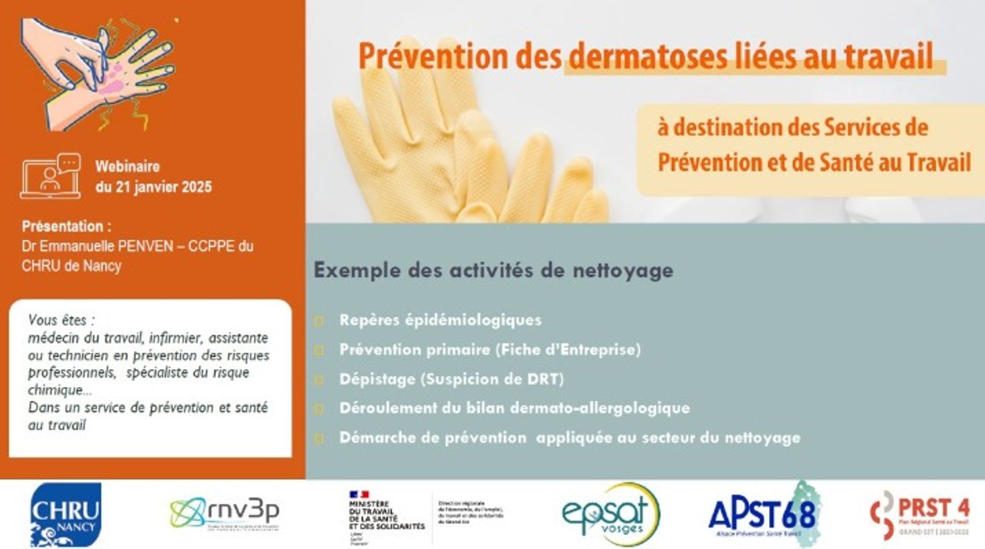 Plus de 330 personnes ont répondus présentes le jour J, (re)vivez cette présentation en suivant le lien ci-après : [Webinaire PRST4 Grand Est - Action 10] Prévention des dermatoses liées au travail 2025-01-21