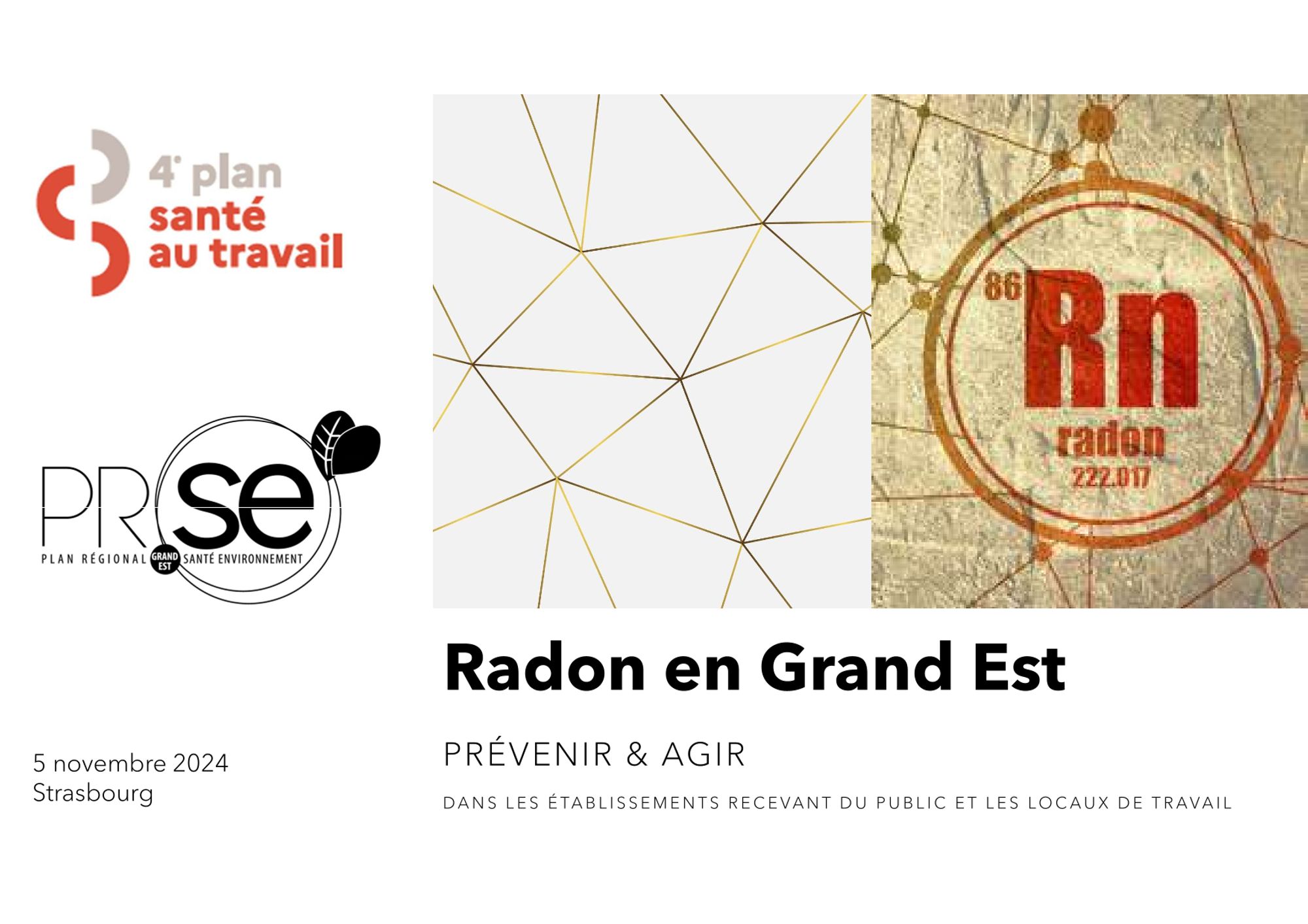 Organisé le 5 novembre 2024 à Strasbourg, dans le cadre du Plan Régional Santé Travail et du Plan Régional Santé Environnement, avec la collaboration de l’IRSN, le CHRU de Nancy, la CARSAT Centre Ouest et de nombreux autres partenaires, cet événement a pour objectif de continuer à faire connaître les enjeux de santé publique et de santé au travail liés au radon, de comprendre les obligations réglementaires et de partager sur les mesures à mettre en œuvre pour préserver la santé de chacun.
