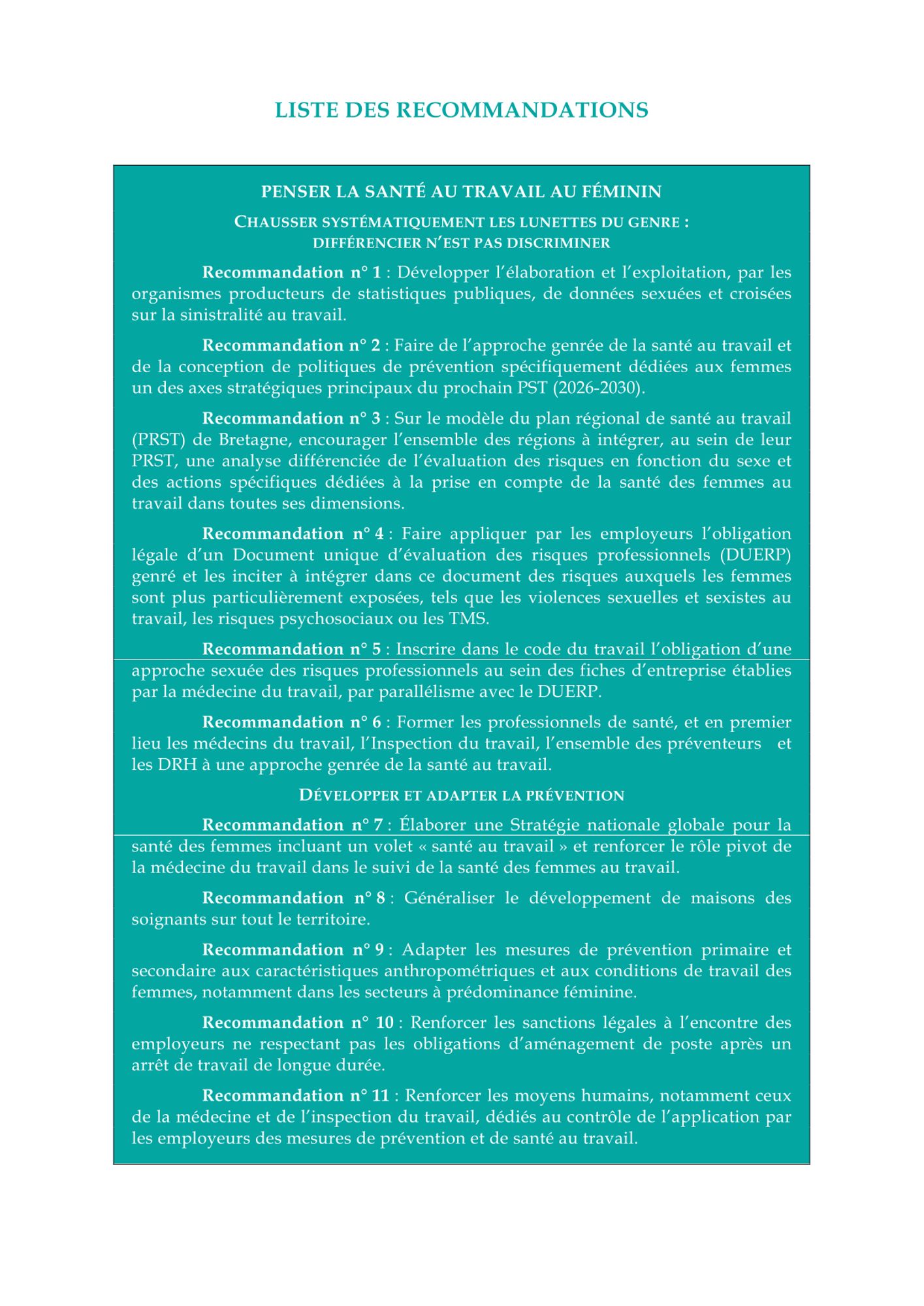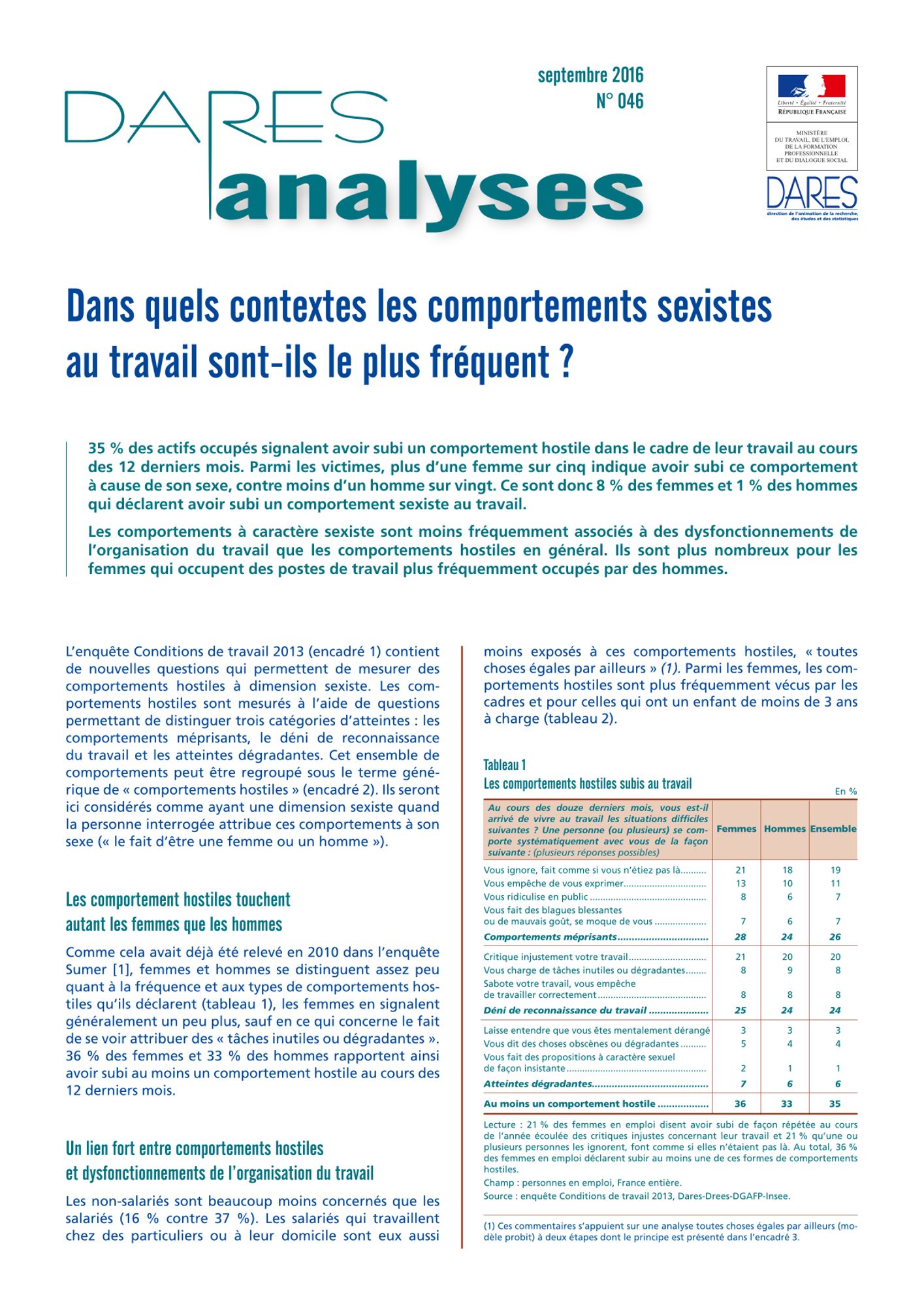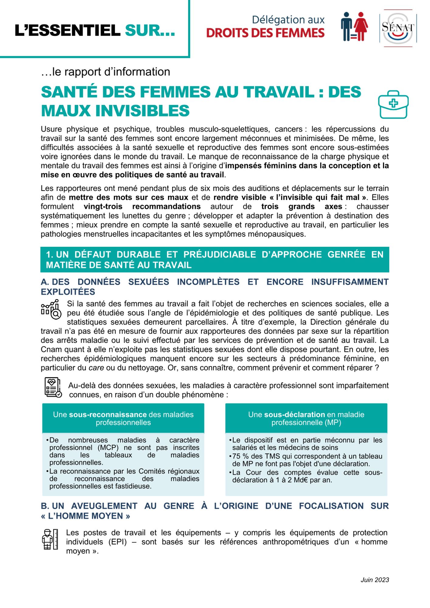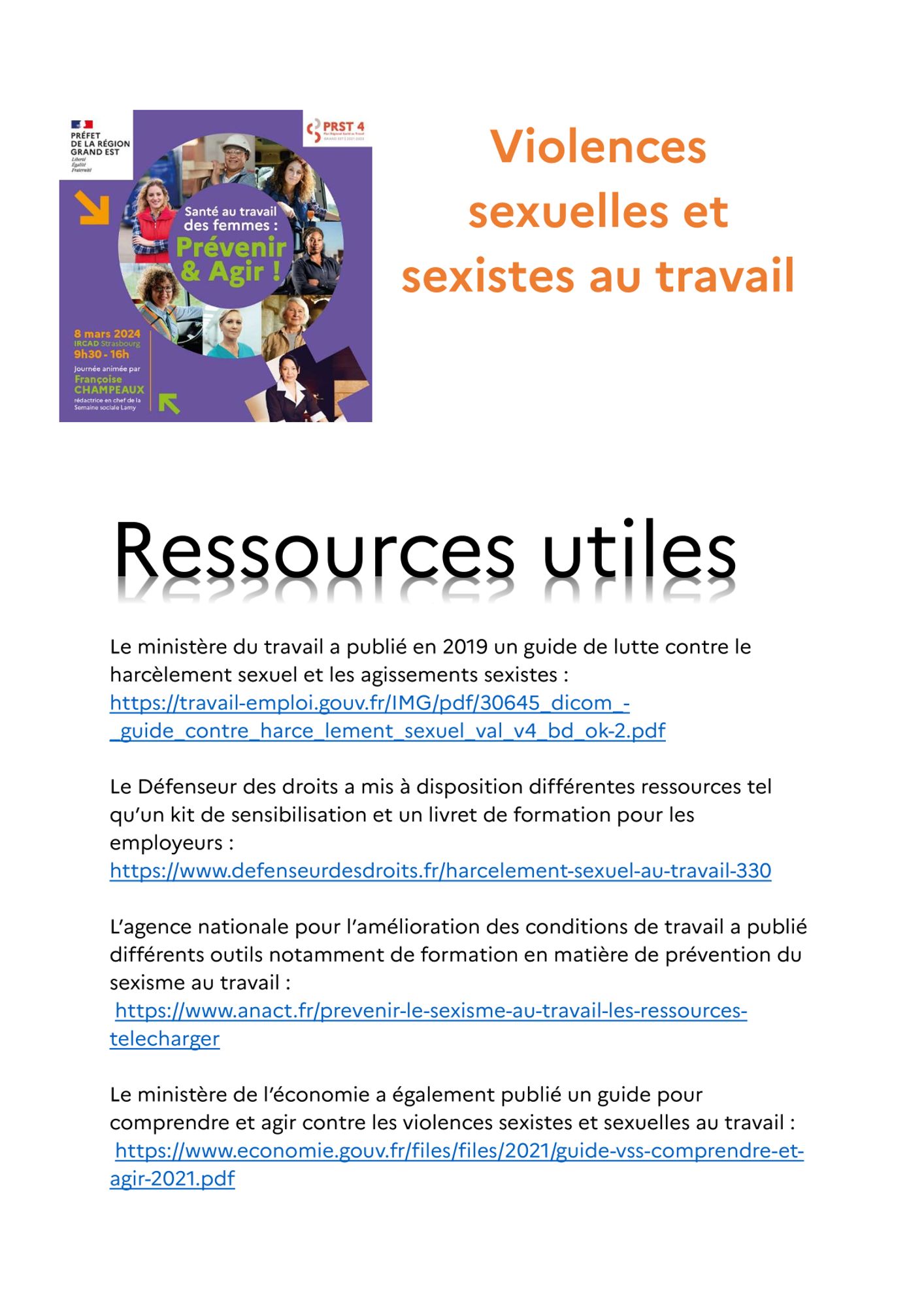 Documentation Rapport 2023 du Sénat sur la santé des femmes au travail (461.3 Ko) L'essentiel sur le rapport du Sénat de 2023 sur la santé au travail des femmes (81.9 Ko) Ressources sur les violences sexuelles et sexistes au travail (340.6 Ko) Plaquette d'information sur la santé au travail des femmes (1.1 Mo) Etude ANACT sur la sinistralité au travail en France selon le sexe de 2001 à 2019 (1.6 Mo) Guide pratique (47.0 Mo) Etude de la DARES sur les conditions de travail selon les sexes (1.8 Mo) Etude de la DARES sur les comportements sexistes (470.3 Ko)