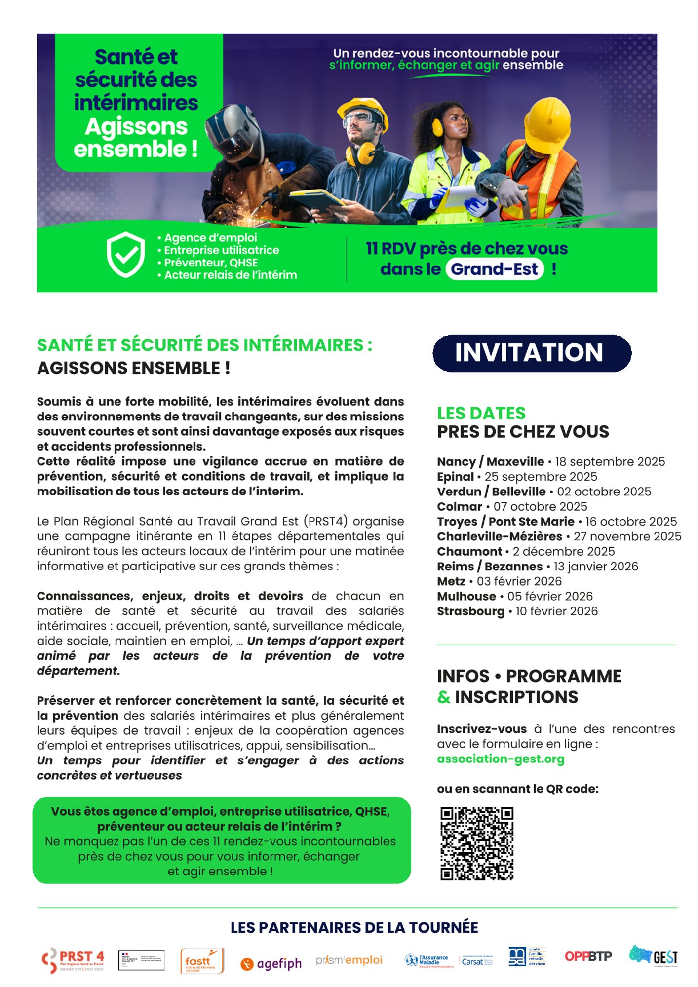 Dans le cadre du PRST 4 de la région Grand Est, le groupe de travail qui se consacre aux publics fragiles organise une campagne itinérante en 11 étapes départementales sur la santé et la sécurité des intérimaires.