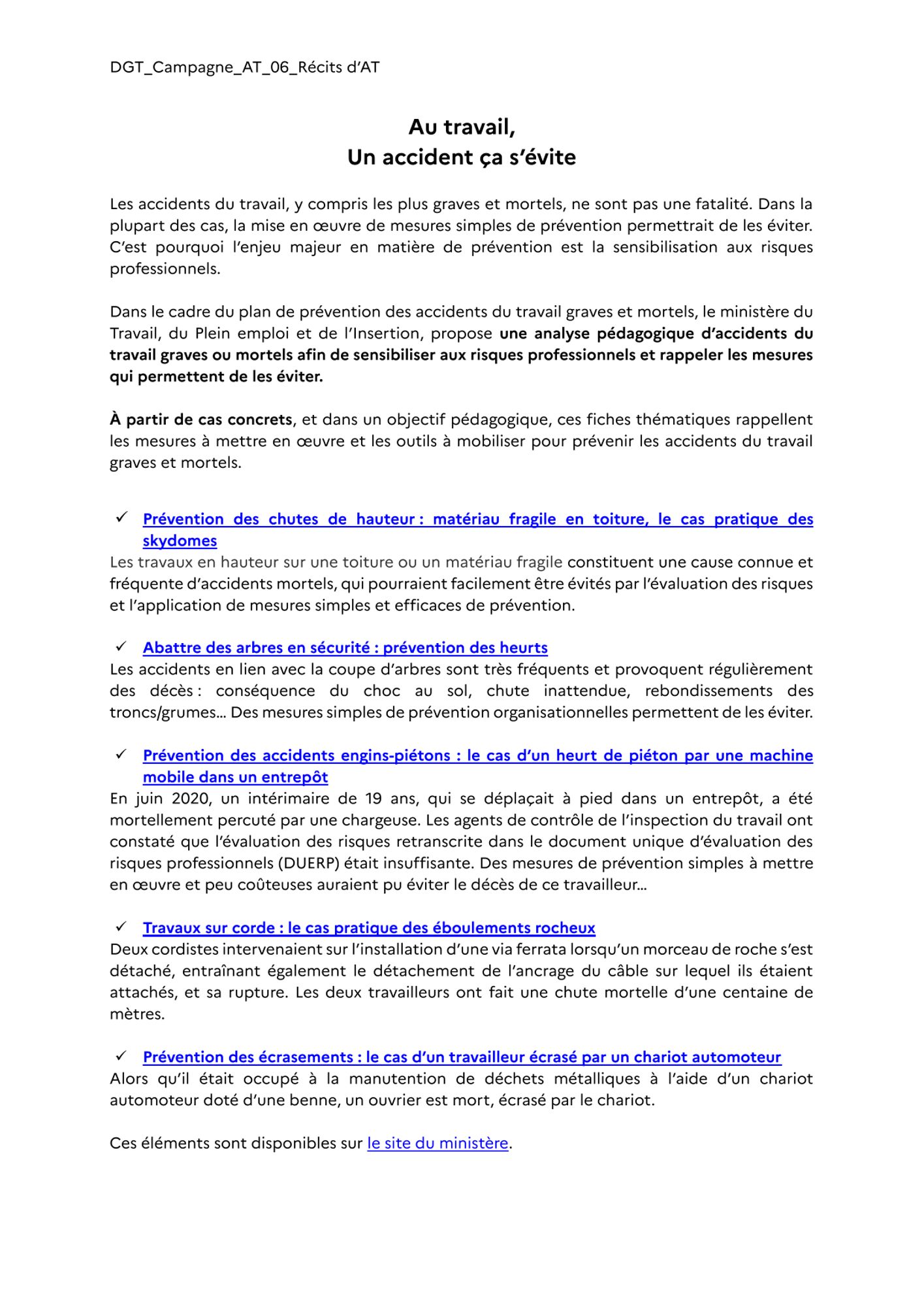 - Un document (avec des liens) décrivant certaines situations génératrices d’accident du travail,