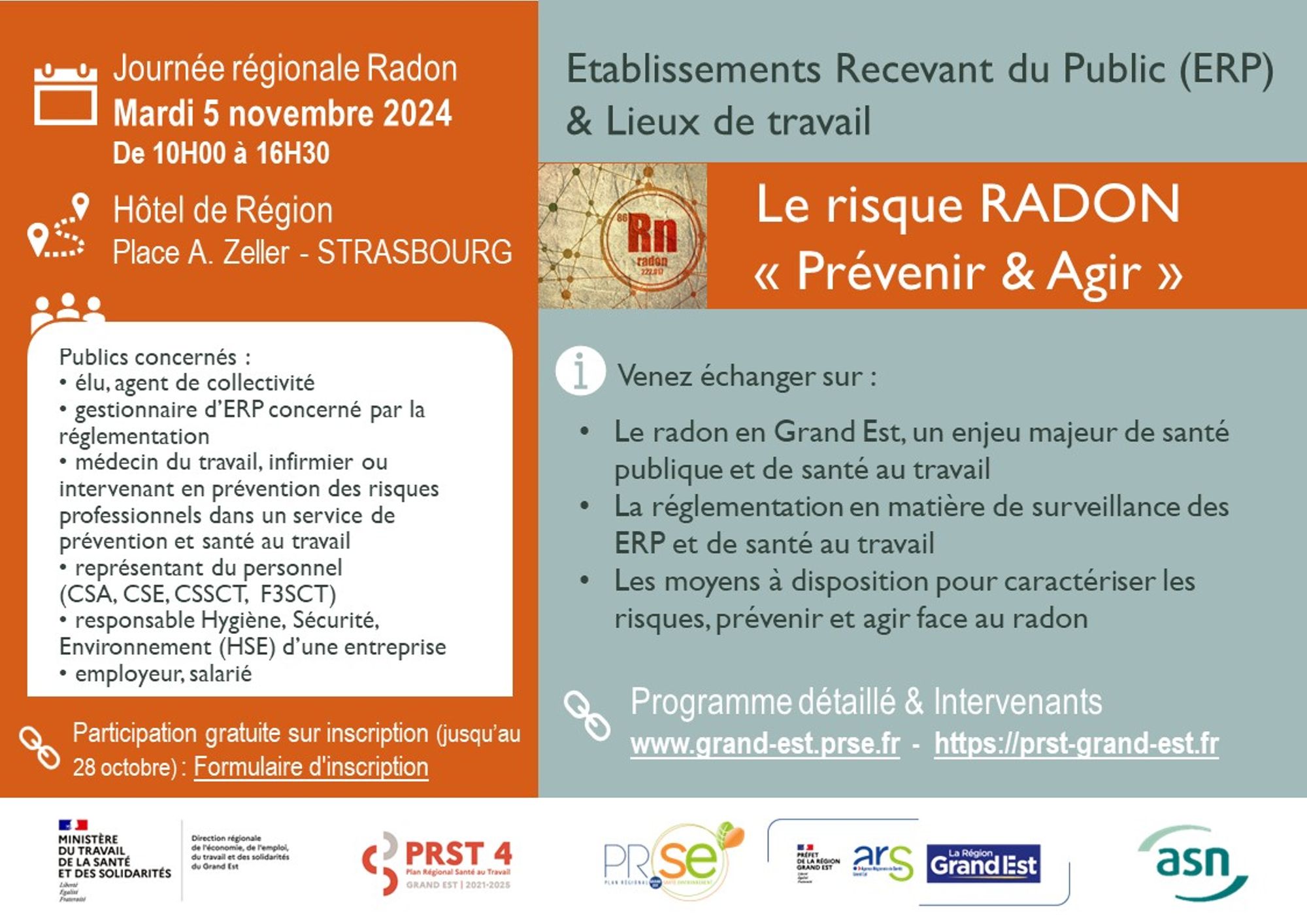 Cette journée, qui se tiendra le mardi 5 novembre à l'Hôtel de Région à Strasbourg, est organisée par la DREETS (Direction régionale de l'économie, de l'emploi, du travail et des solidarités), l’ARS (Agence Régionale de Santé) et l’ASN (Autorité de Sûreté Nucléaire) dans le cadre du Plan Régional Santé Travail et du Plan Régional Santé Environnement, avec la collaboration de l’IRSN, du CHRU de Nancy, de la CARSAT Centre Ouest et de nombreux autres partenaires !