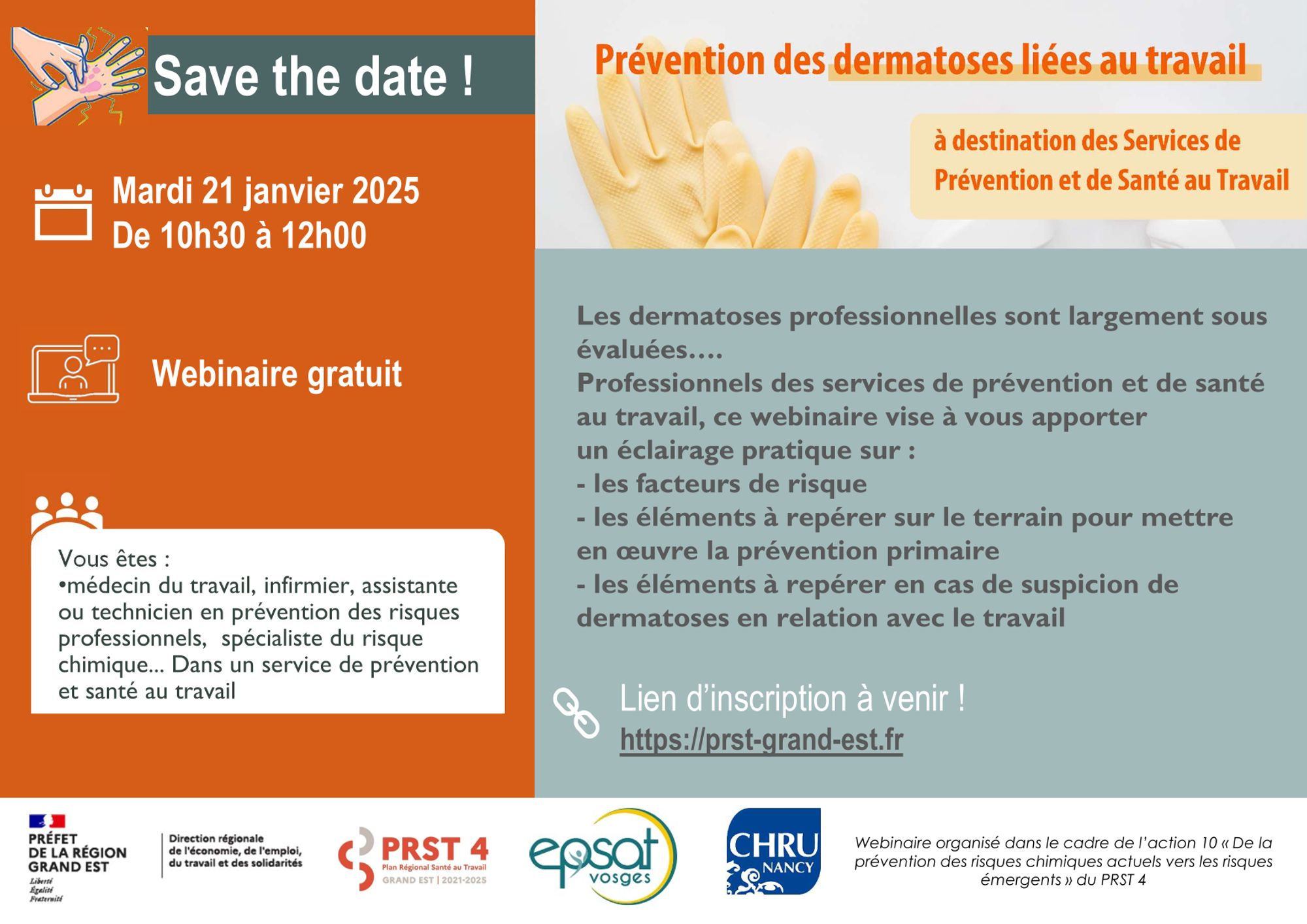 Plus de 330 personnes ont répondus présentes le jour J, (re)vivez cette présentation en suivant le lien ci-après : [Webinaire PRST4 Grand Est - Action 10] Prévention des dermatoses liées au travail 2025-01-21