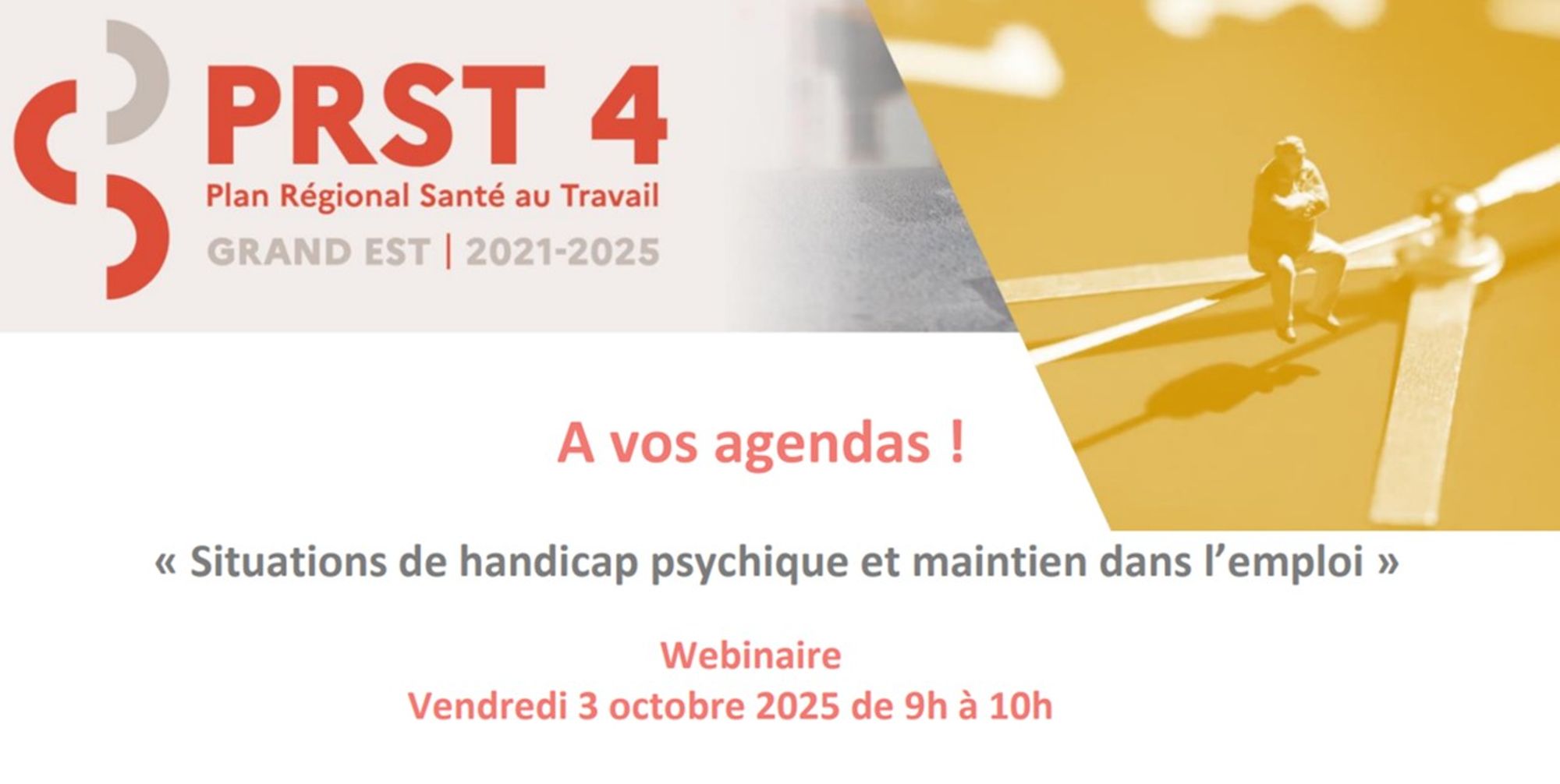 Le Plan régional santé au travail du Grand Est propose un webinaire, dans le cadre de la programmation « l’heure du maintien », consacré au maintien dans l’emploi des personnes en situation de handicap psychique.