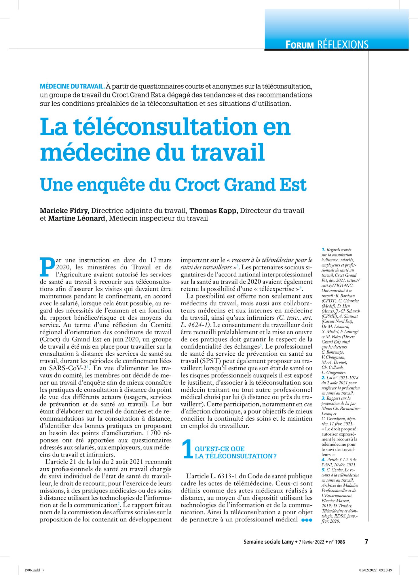 Téléconsultation La téléconsultation en médecine du travail (207.1 Ko) PRST GE : Regards croisés sur la consultation à distance en médecine du travail (1.7 Mo) La téléconsultation en médecine du travail (article Semaine sociale Lamy) (1.2 Mo)