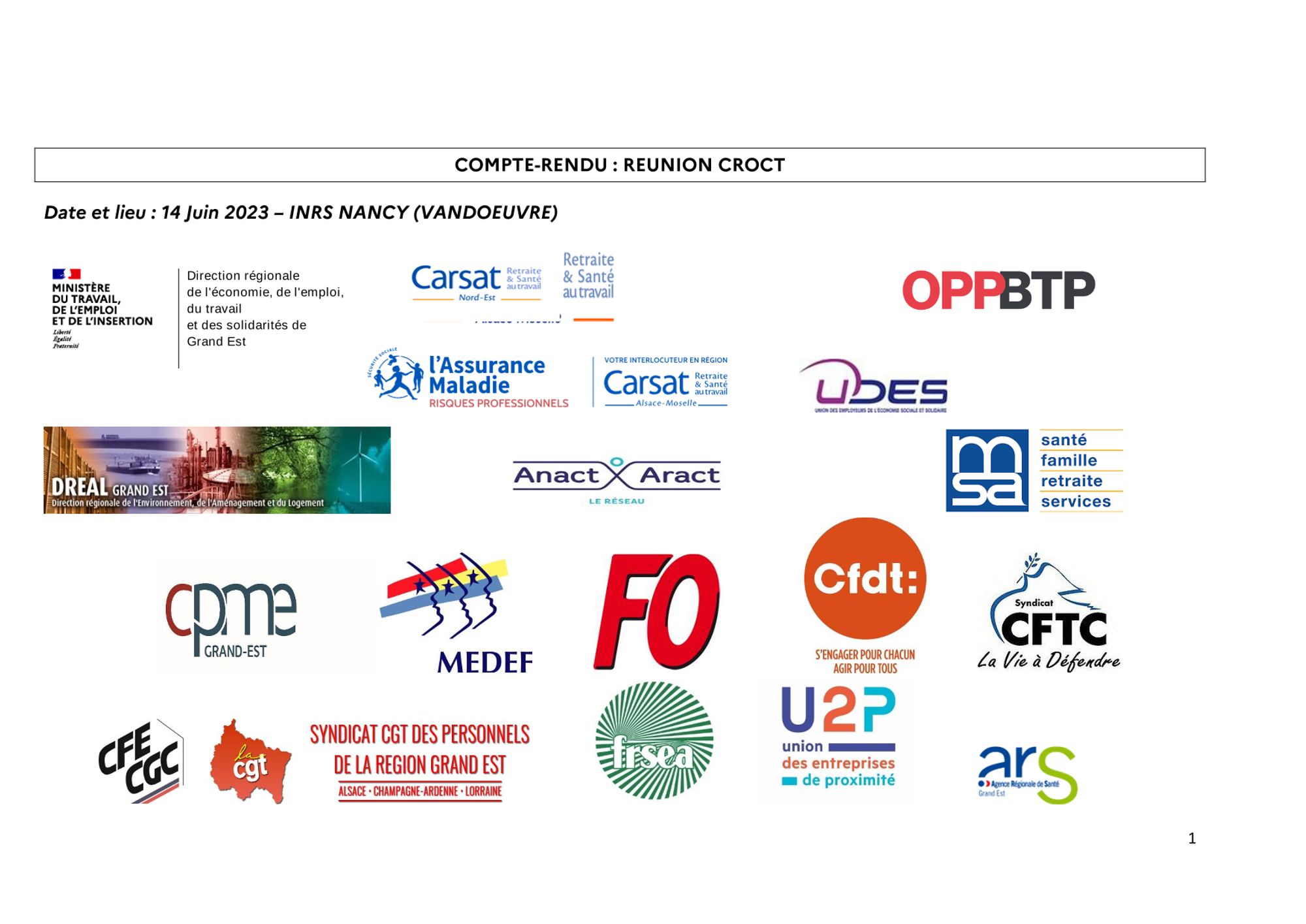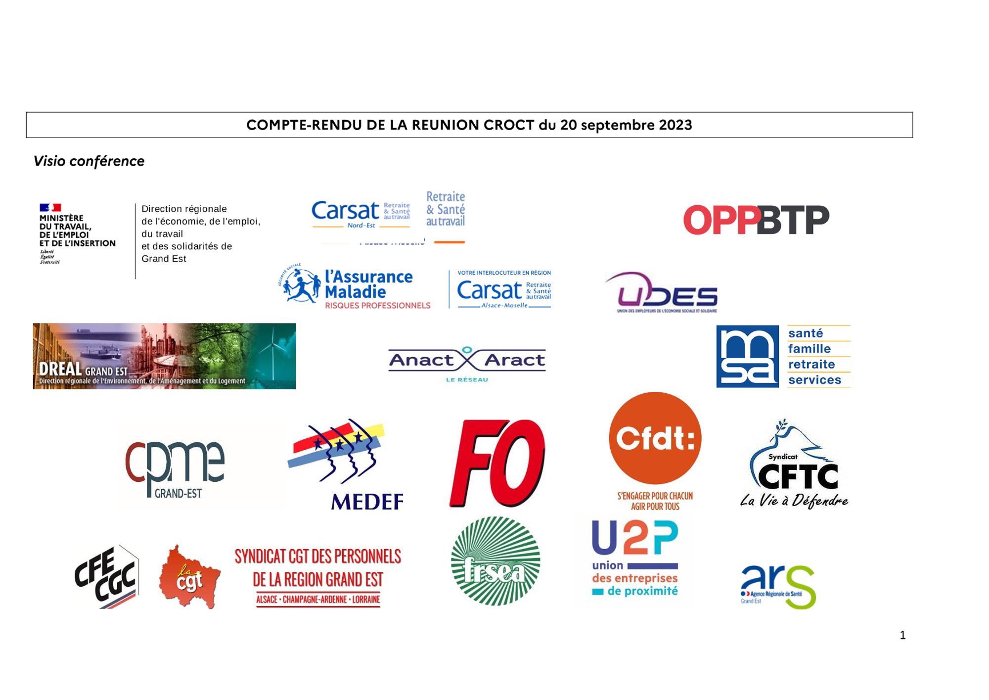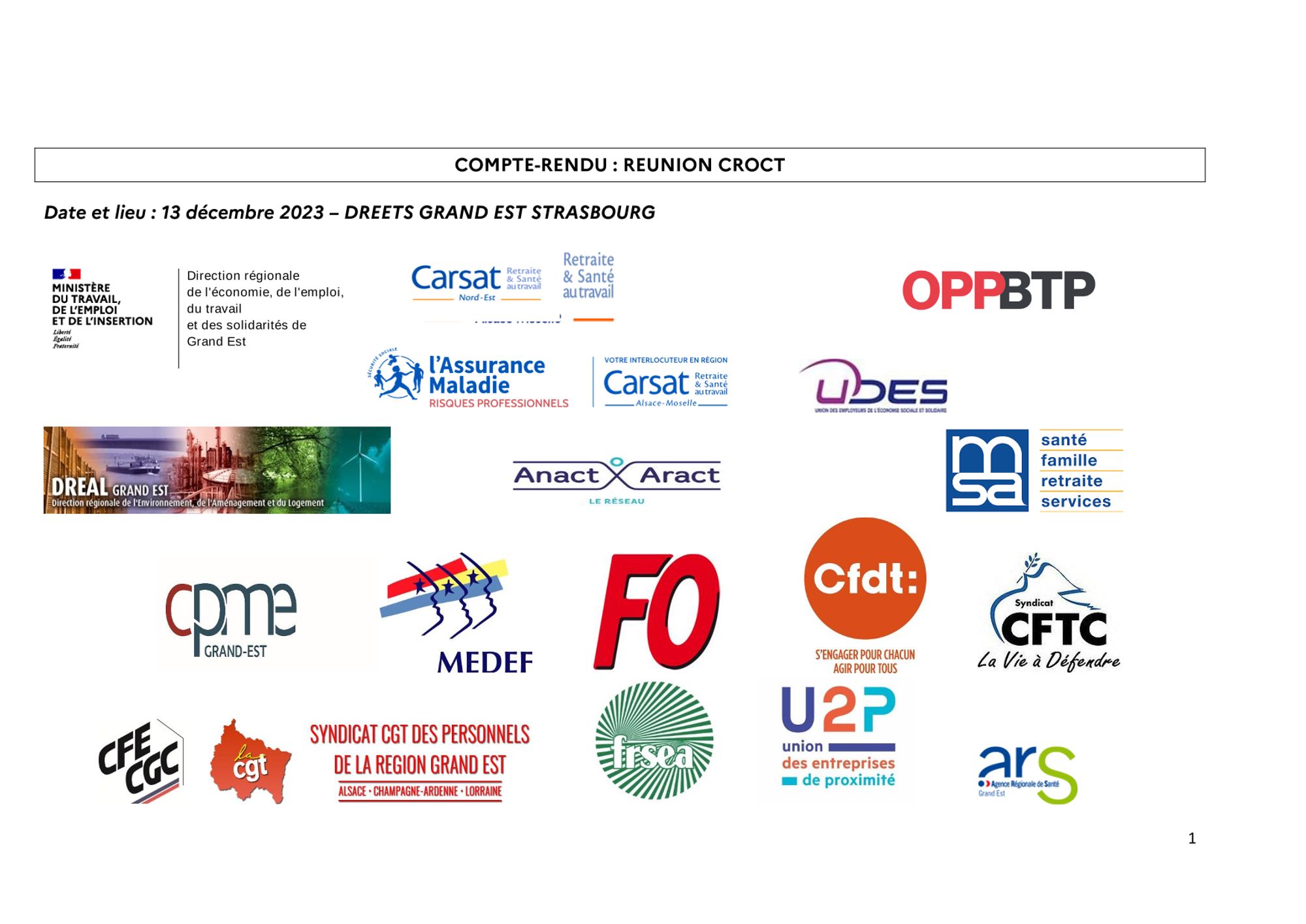 Comptes-rendus des réunions du CROCT et du CRPST CR réunion CROCT du 29.3.2023 (755.4 Ko) CR réunion CROCT du 14.6.2023 (836.3 Ko) CR de la réunion du CROCT du 20.9.2023 (875.6 Ko) CR de la réunion du CROCT du 13.12.2023 (966.0 Ko) CR de la réunion du CROCT du 20.3.2024 (702.8 Ko) CR de la réunion du CRPST du 1.2.2024 (169.1 Ko) Modalités d'application régionale du cahier des charges national d'agrément des Services de Prévention et de Santé au Travail du GRAND-EST CR de la réunion du CROCT du 19.6.2024 (370.3 Ko)