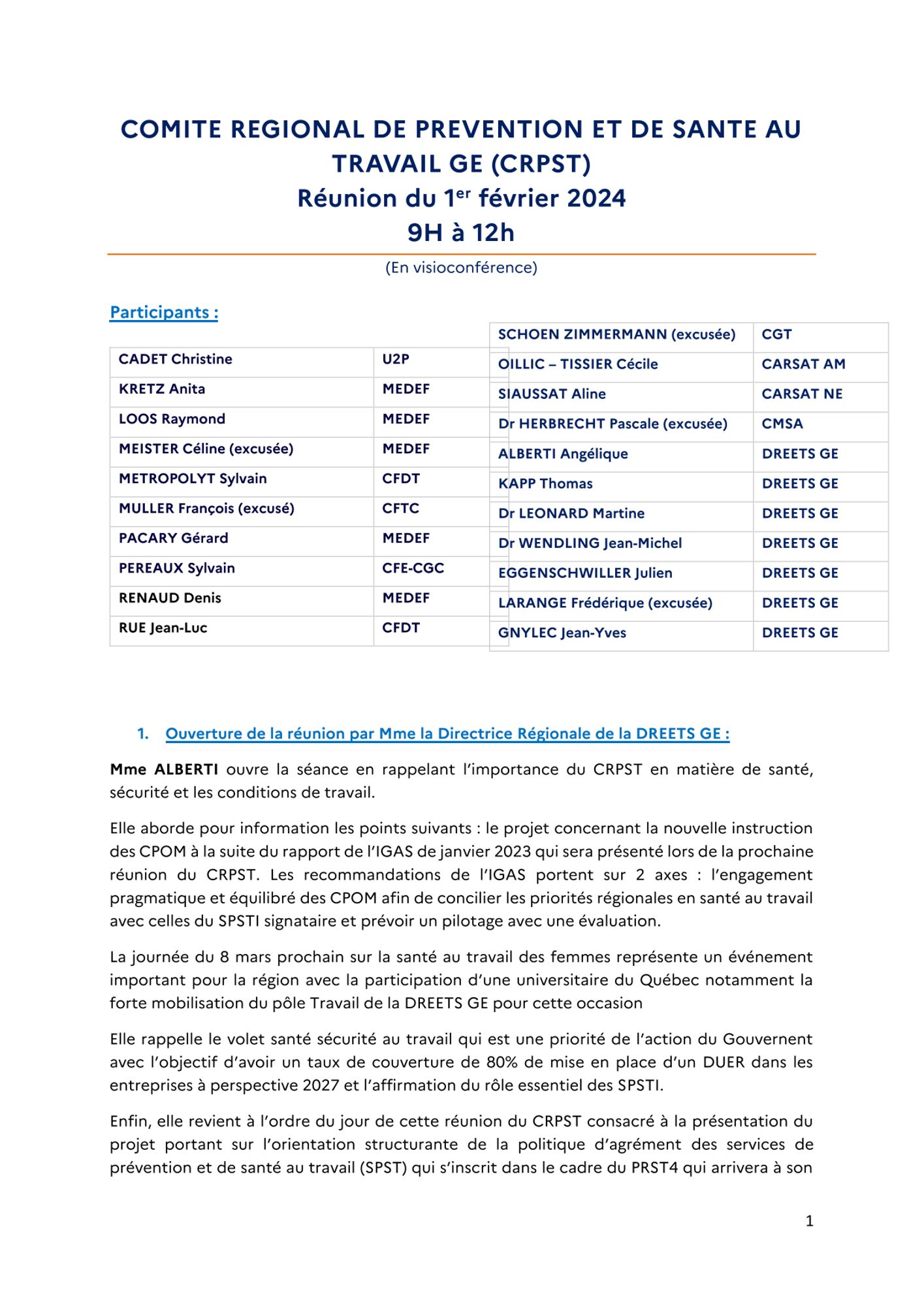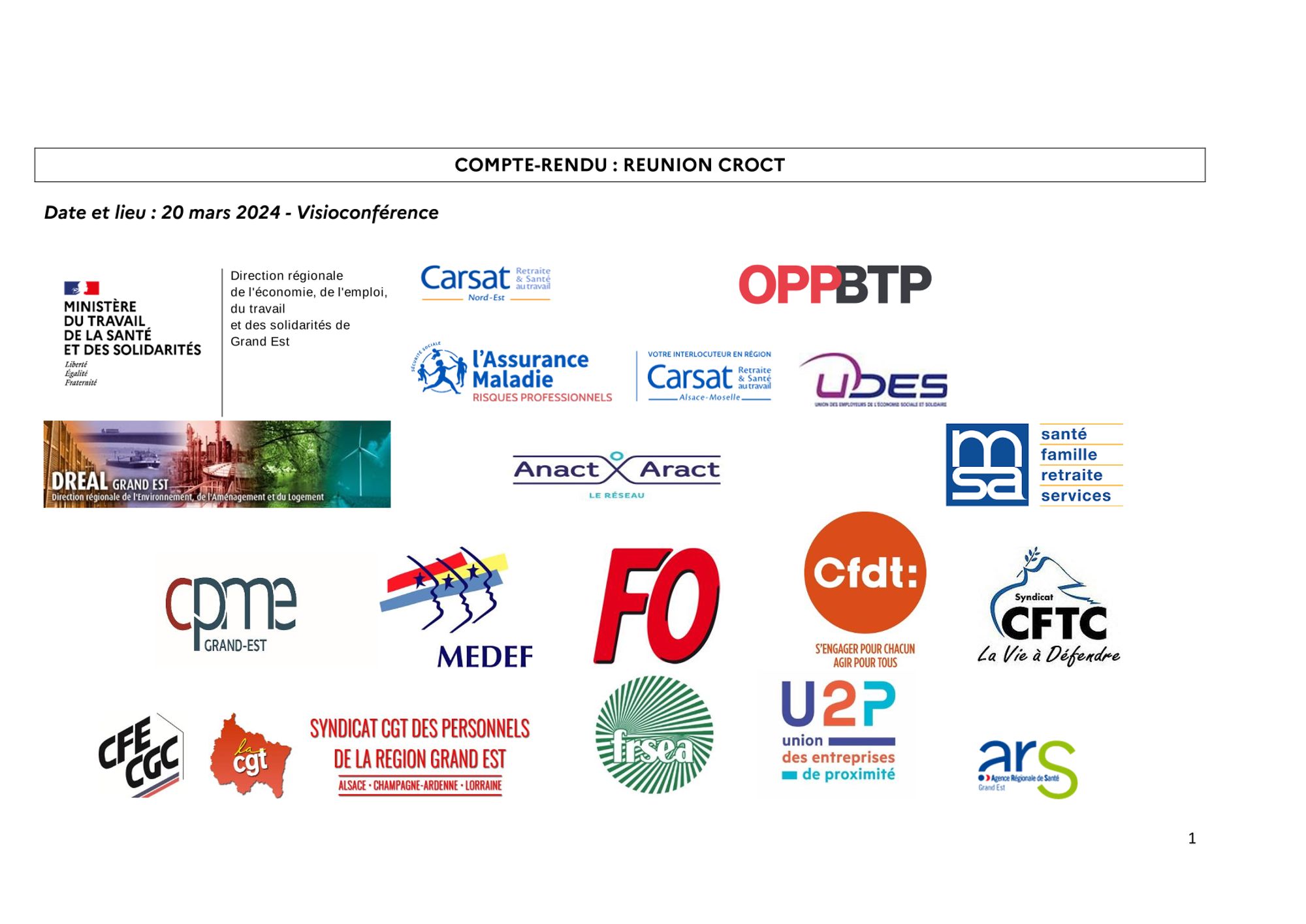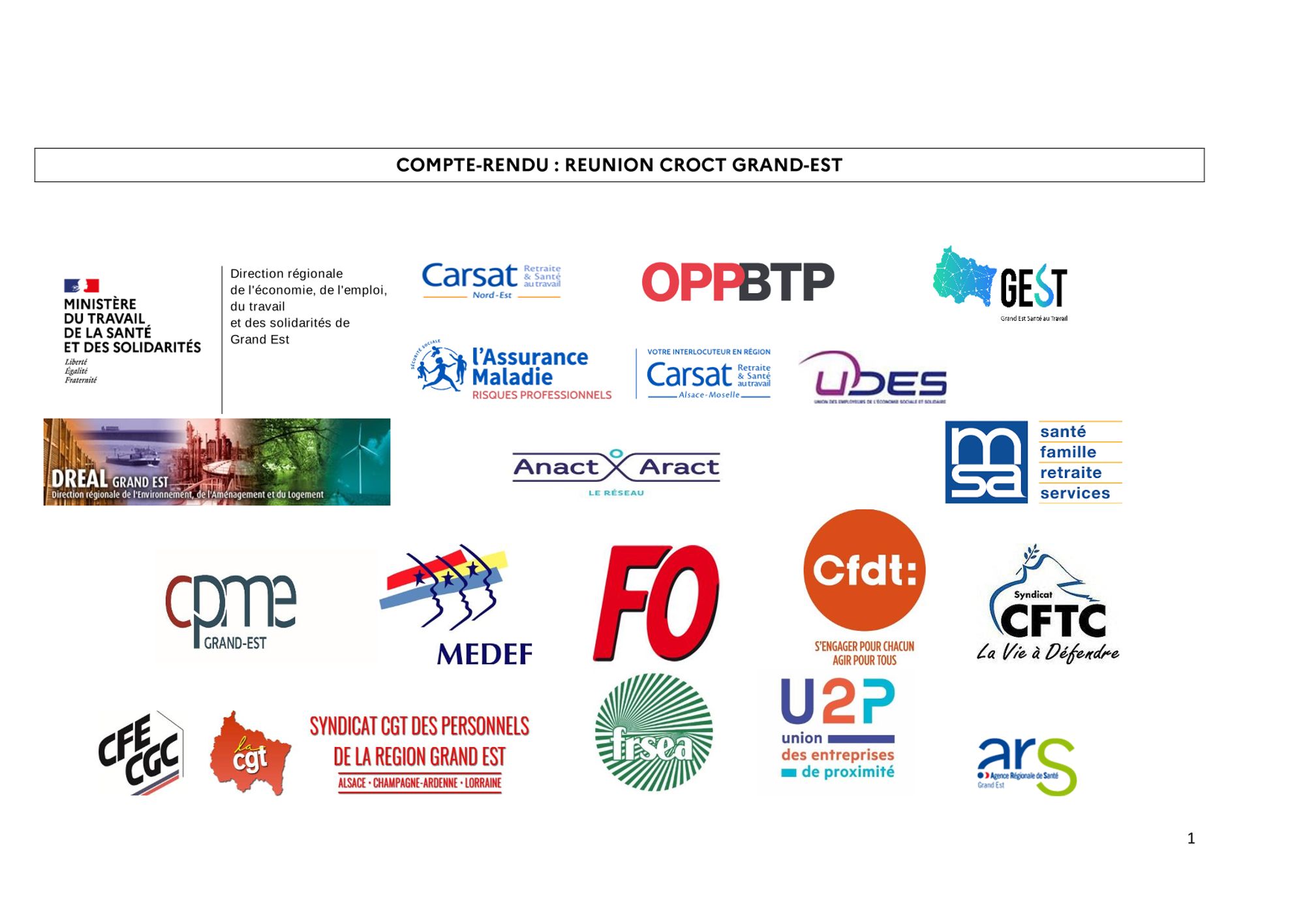 Comptes-rendus des réunions du CROCT et du CRPST CR réunion CROCT du 29.3.2023 (755.4 Ko) CR réunion CROCT du 14.6.2023 (836.3 Ko) CR de la réunion du CROCT du 20.9.2023 (875.6 Ko) CR de la réunion du CROCT du 13.12.2023 (966.0 Ko) CR de la réunion du CROCT du 20.3.2024 (702.8 Ko) CR de la réunion du CRPST du 1.2.2024 (169.1 Ko) Modalités d'application régionale du cahier des charges national d'agrément des Services de Prévention et de Santé au Travail du GRAND-EST CR de la réunion du CROCT du 19.6.2024 (370.3 Ko)