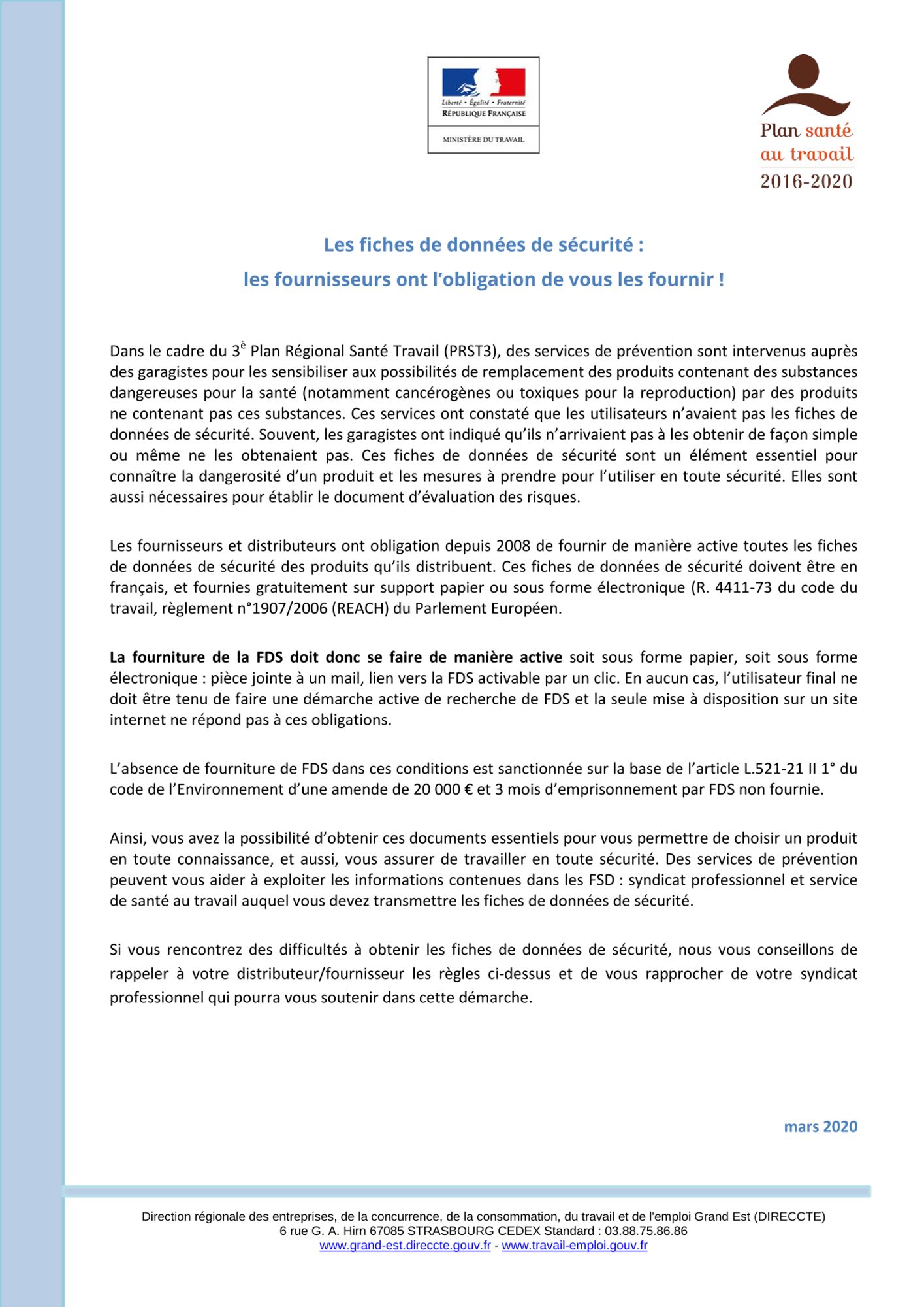 - Un document d’information sur les fiches de données de sécurité à fournir à destination des garagistes.