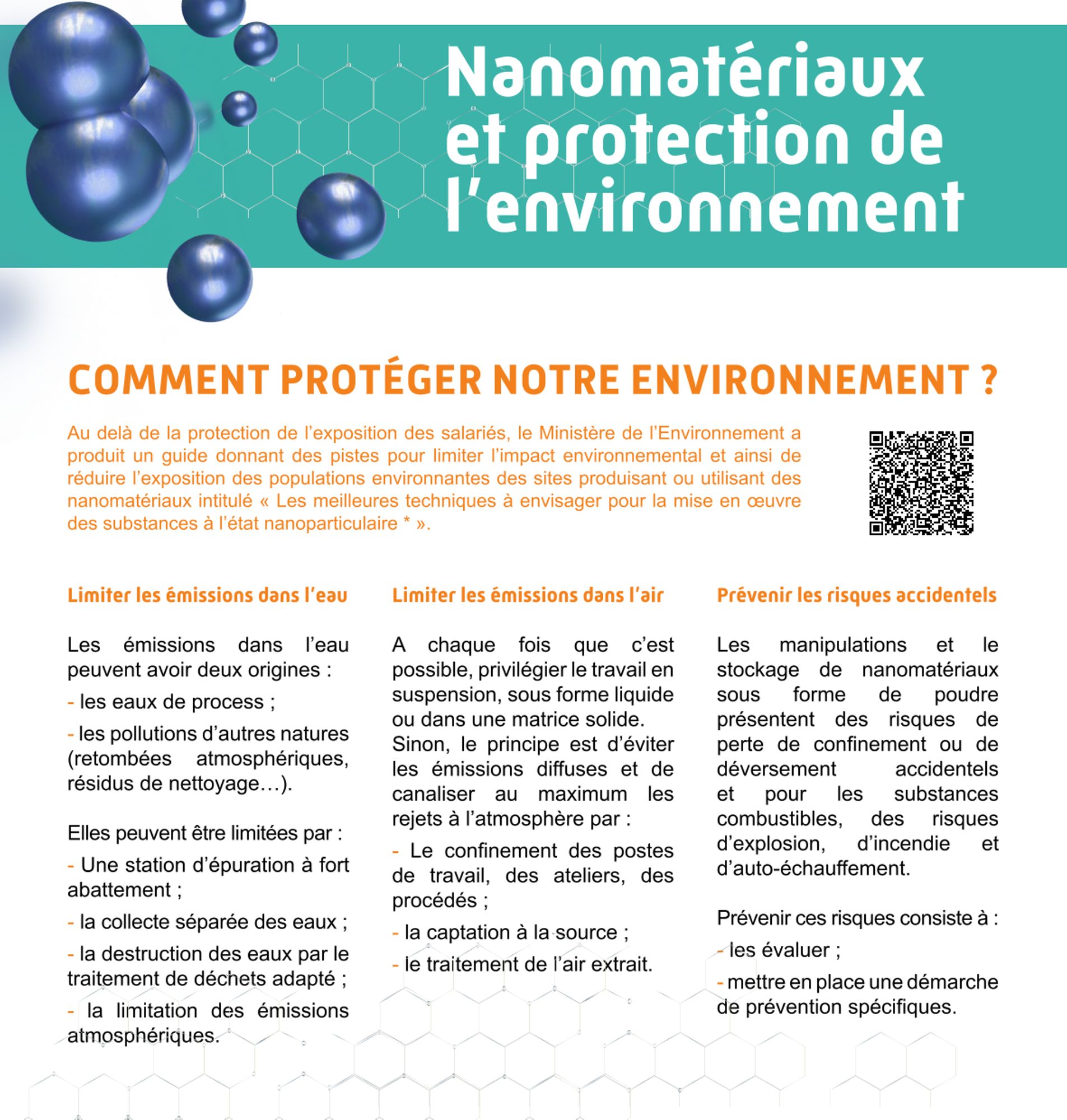 - Création d’un document sur le volet « risque des nanomatériaux pour l’environnement » qui vient compléter la plaquette INRS ED 6309 relative à la prévention en entreprise pour les salariés